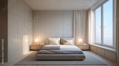 bedchamber, minimalist, modern, interior, design, decor, home, bed, pillow, blanket, cosy, elegant, neutral, beige, light, roomy, window, sunlight, curtain, sheer, daylight, built-in, storage, urban, lifestyle, luxury, contemporary, peaceful, clean, simplicity, stylish, real estate, architecture, residential, relaxation, living space, uncluttered, serene, apartment, comfort, neat, interior design, home decor, bright, warm light