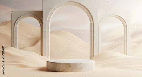 desert, dune, arch, stone, beige, cream, minimalist, dais, platform, background, architecture, serene, calm, peaceful, elegant, luxury, modern, contemporary, pastel, soft, light, sandy, presentation, showcase, display stand, branding, advertising, marketing, neutral, simple, clean, abstract, marble, archway, geometric, texture, smooth