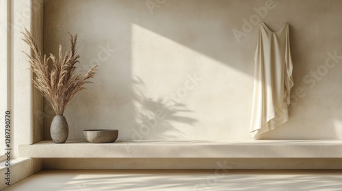 neutral, minimalist, beige, cream, off-white, textured, wall, sunlight, shadow, natural, light, interior, room, decor, design, styling, aesthetic, simple, modern, elegant, calm, serene, peaceful, tranquil, minimal, subtile, organic, texture, stone, concrete, dried, flower, vase, bowl, clothing, garment, draped, fabric, shelf, sunbeam, window, bright, soft, warm, palette, home, space, still