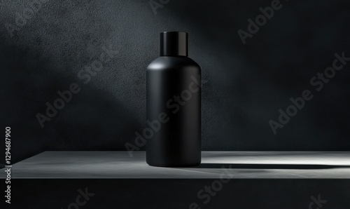 Minimalist black dispenser bottle resting on a smooth surface, softly illuminated to emphasize its sleek and modern design