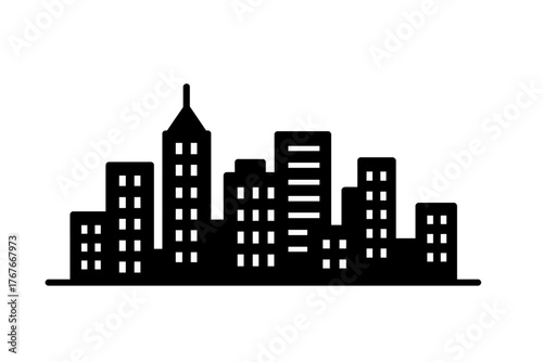 Minimalist black silhouette of a modern urban city skyline featuring skyscrapers and apartment buildings