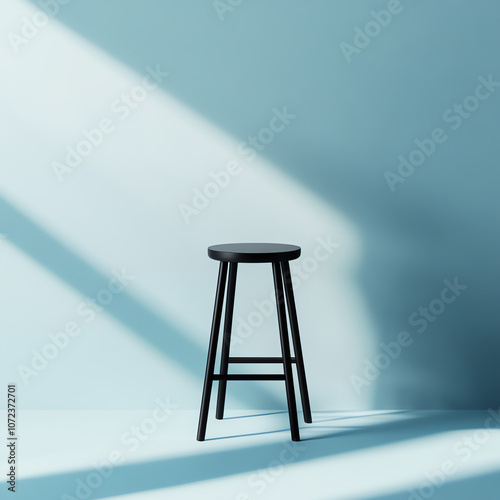 Minimalist Black Stool Against Blue Background with Dramatic Shadows