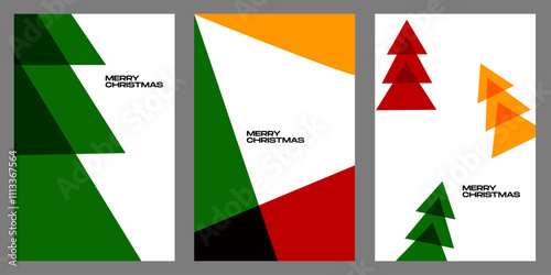 Minimalist Christmas-themed designs featuring geometric tree shapes in green, red, and orange with modern layouts and "Merry Christmas" text on a white background.