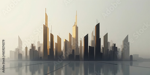 Minimalist Cityscape A light gray background with abstract, geometric skyscraper shapes in black and gold. The lighting is soft