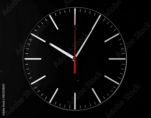 Minimalist clock. Black face, white hands, red second hand