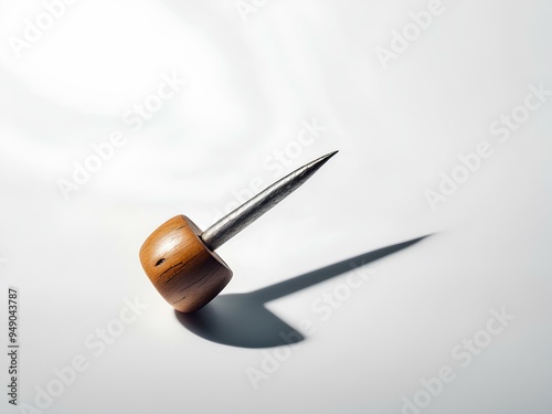 minimalist close-up of a nail with a wooden handle, casting a sharp shadow on a white background, showcasing modern design elements