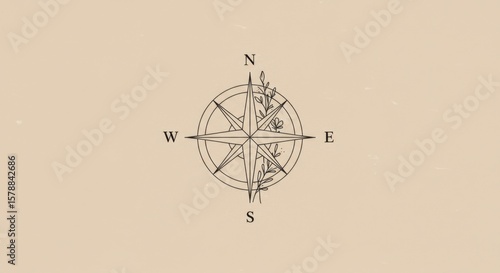 Minimalist Compass Rose Illustration with Floral Accents