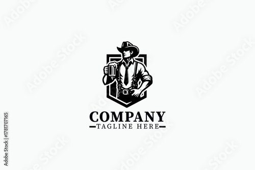 Minimalist Cowboy Holding Beer Vector Logo – Black Silhouette of Western Cowboy Raising Beer Mug in Cheerful Pose, Simple Bold 2D Design for Bar Branding, Saloon Illustration, Festival Mascot, and Wil