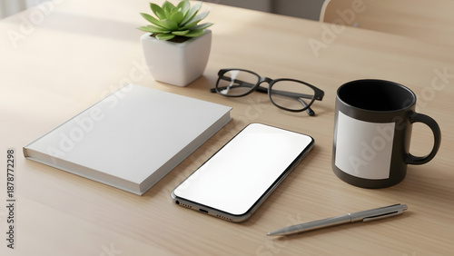 desktop, workspace, smartphone, phone, book, mug, pen, plant, table, office, work, minimalist, clean, modern, design, template, branding, product, digital, screen, display, copy, space, lifestyle, business, technology, stationery, education, study, web log, app, website, marketing, online, remote, topview, accessory, hot drink, goggles, succulent