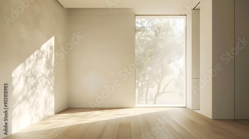 room, empty, minimalist, wooden, floor, window, large, interior, design, simple, modern, white, wall, light, sun, shadow, architecture, house, home, space, clean, bright, airy, natural, tree, view, neutral, contemporary