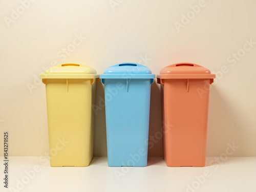 Minimalist Flat Lay of Colored Recycling Bins for Paper, Plastic, and Metal on Pastel Background