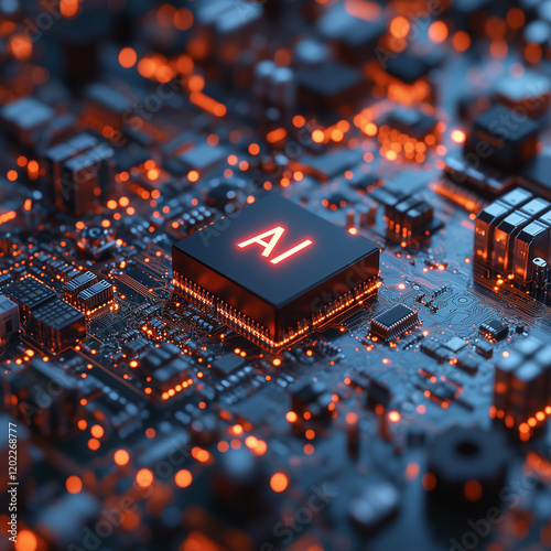 Minimalist gears and microchip patterns forming a symmetrical design around the letters "AI." Bright lighting, contrast