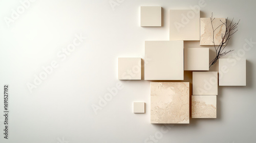 Minimalist geometric squares arranged light background, creating serene and modern aesthetic. composition includes natural elements for contrast