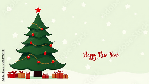 Minimalist green Christmas tree with red zigzag decorations, festive elements and happy new year greeting on a postcard vector illustration.
