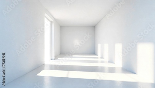 Minimalist Hallway with Architectural Details A pristine, minimalist hallway bathed in soft, diffused natural light. Focus on the clean lines, geometric angles, and subtle shadow play of the
