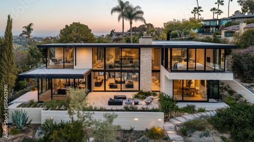 Minimalist hilltop house with panoramic views, clean architectural lines, and a sophisticated, warm-toned facade
