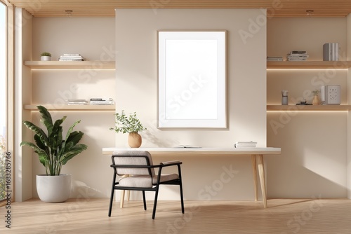 minimalist, home, office, interior, design, wooden, light, beige, cream, modern, blank, poster, frame, shelf, book, plant, vase, desk, chair, sunlight, natural, wood, floor, wall, decor, stylish, simple, clean, contemporary, calm, space, cosy, room, furniture, empty, bright, organised, elegant, workspace, fresh, neutral, aesthetic