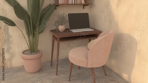 home office, workspace, laptop, desk, chair, plant, minimalist, indoor, relaxing, calm, serene, peaceful, simple, elegant, modern, cosy, comfortable, study, interior design, home decor, beige, brown, pink, potted plants, laptop, room, apartment, house, office, workplace, lifestyle, aesthetic, clean, organised, quiet, tranquil, natural light