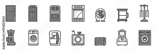 washing machine, refrigerator, microwave, toaster, vacuum cleaner, iron, blender, fan, coffeemaker, dishwasher, hair drier, icon, minimalist, monochromatic, appliance, household goods, housekeeping, simple icons, home improvement, domestic life