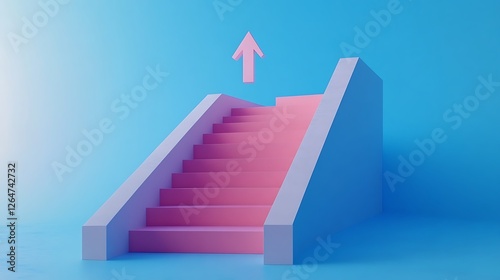Minimalist image of a white staircase leading upwards against a blue background, with an arrow pointing up at the top