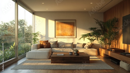 Minimalist interior design of modern living room urban home bright natural light wide angle serenity and style