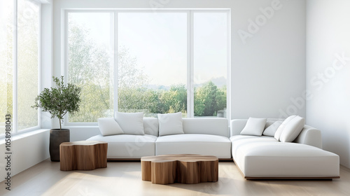 Minimalist interior design of modern living room with white sectional sofa and wooden accent tables