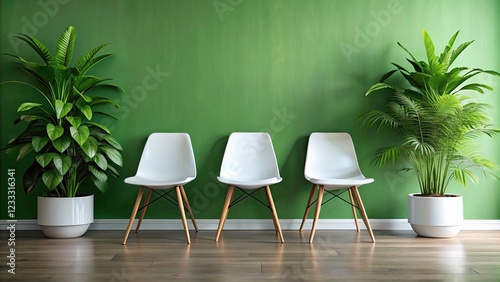 Minimalist Interior Design with White Chairs and Green Plant in Bright Space for Urban Exploration Photography