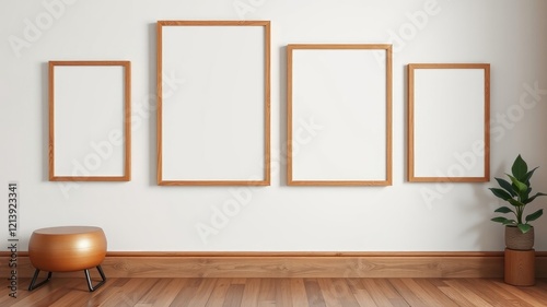 Minimalist Interior Mockup Four Empty Wooden Frames on White Wall with Modern Stool and Plant