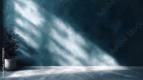 sunlight, shadow, wall, plant, minimalist, interior, light, pattern, floor, shadow, sun, ray, beam, abstract, modern, blue, dark, grey, concrete, texture, clean, serene, calm, mood, dramatic, atmosphere, natural, daylight, home, room, space, empty, simple, design, decor, style, architectural, background, conceptual, aesthetic, pot, foliage, leaf, bright, contrast, soft, tranquil, stripes