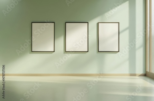 Minimalist interior with light green walls and three sleek A4 picture