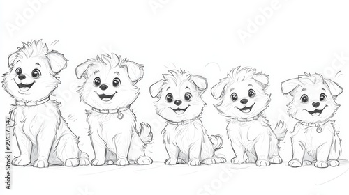 Minimalist kids drawing of happy dogs in black and white ink line art
