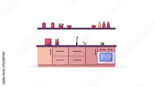 kitchen, minimalist, cabinet, wood, light, oven, shelf, floating, canned, good, sauce, bowl, sink, countertop, simple, design, modern, clean, neat, organised, cooking, food, storage, appliance, domestic, home, interior, style, flat, illustration, vector, graphic, blood-red, compact, functional, efficient, contemporary, streamlined, uncluttered, aesthetic, kitchen utensile, utensil, dish, bottle, red, container, spice