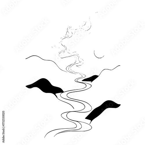 minimalist, landscape, river, mountain, smoke, vector, art, illustration, design, template, drawing, nature, scenery, black-and-white, abstract, graphic, outline, modern, simple, artistic