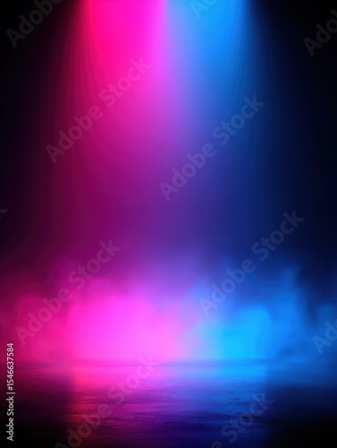 Minimalist laser spotlight creates a vibrant neon pink and blue gradient in a foggy atmosphere. This dark background enhances the colorful neon effect for a stylish abstract look.