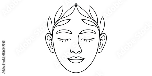 Minimalist line art face with laurel wreath crown