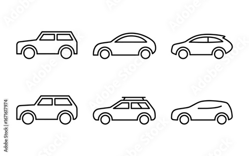 linear, minimalist, car, suv, icon, black, white, outline, automobile, transportation, vehicle, design, set, collection, modern, style, abstract, sleek, simple, contour, graphic, illustration, art, driving, auto, line, elegant, monochrome, trendy, urban, wheel, hatchback, bumper, door, shape, curve