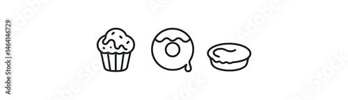 minimalist, line, drawing, cupcake, donut, pie, symbol, black, white, dessert, sweet, vignetting, pastry, outline, bakery, treat, food, icon, symbol, simple, illustration, muffin, glaze, icing, trio, design, edible, snack, monochrome