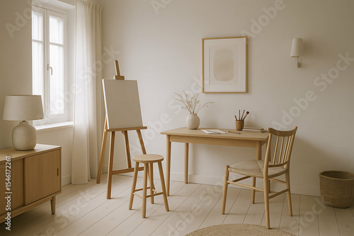 Minimalist living for creators. A minimalist art studio with natural light, featuring a wooden easel, desk, chair, stool, and simple decor in neutral tones.