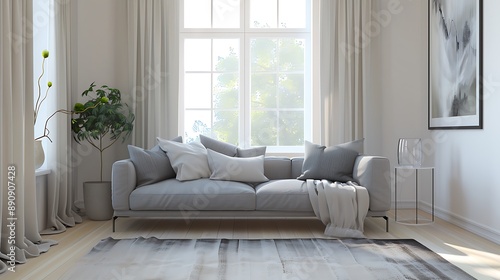 living, room, interior, design, grey, sofa, white, curtain, window, tree, minimalist, abstract, painting, modern, light, bright, contemporary, stylish, comfortable, home, decor, furniture, cushion, throw, blanket, rug, wood, floor, plant, side, table, glasses, art, artwork, wall, natural, sunlight, cosy, airy, roomy, clean