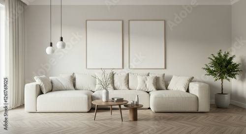 Minimalist living room, Scandinavian design, white L-shaped sofa, wooden coffee table, hanging pendant light, potted indoor plant, large windows, natural light, beige walls, empty canvas frames, cozy