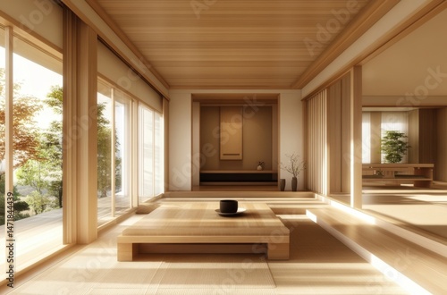 Minimalist living space with wooden furniture