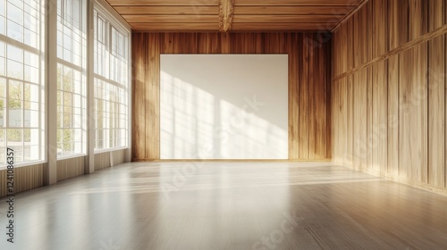 Minimalist meeting room setup in a bright space, featuring a blank white wall, warm wood paneling, and floor-to-ceiling windows.