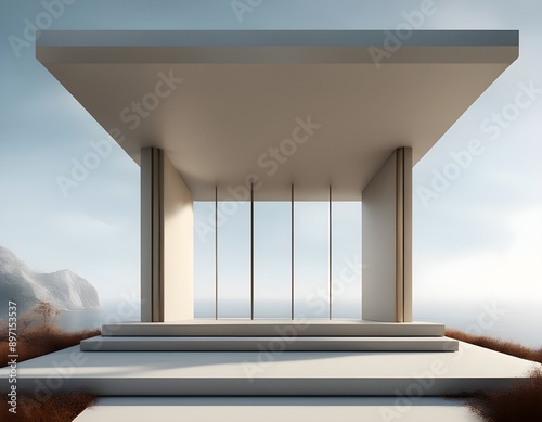 Minimalist modern architecture, geometric concrete structure with glass walls. Open space design, overlooking serene landscape with mountains and sky. Perfect for interior design, architecture, nature