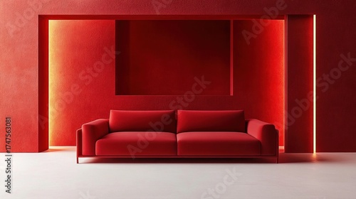 Minimalist modern interior with a red sofa against a textured red wall featuring warm vertical light strips and a recessed rectangular niche, evoking a cozy and stylish ambiance