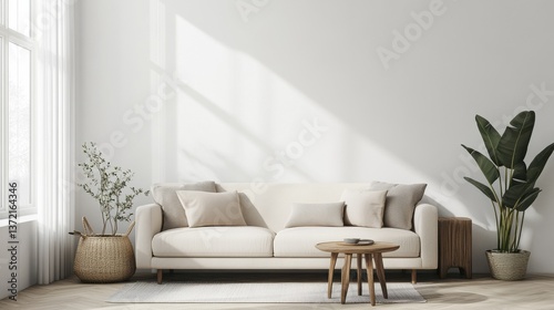 Minimalist modern living room interior background, Scandinavian style, 3D render illustration