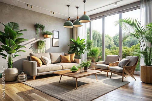 Minimalist Modern Living Room: Neutral Tones & Greenery, Stylish Interior Design Stock Photo