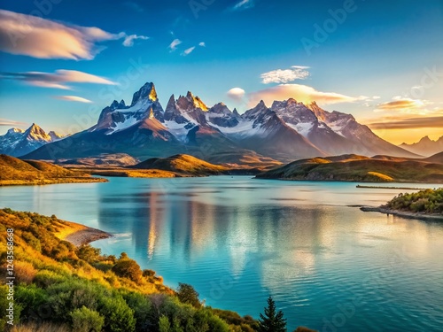 Minimalist Patagonia Landscape: Serene Sea Meets Majestic Andes Mountains in Puerto Natales