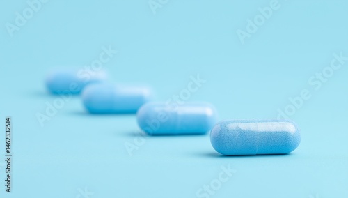 Minimalist pharmaceutical still life with blue capsule medications arranged in diagonal row on matching blue background, showcasing monochromatic medical concept