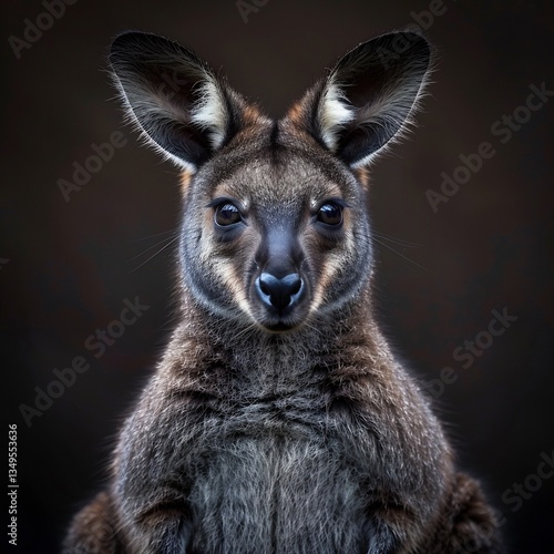 Minimalist photo of swamp wallaby against a plain dark background dramatic single source lighting strong shadows high end photography