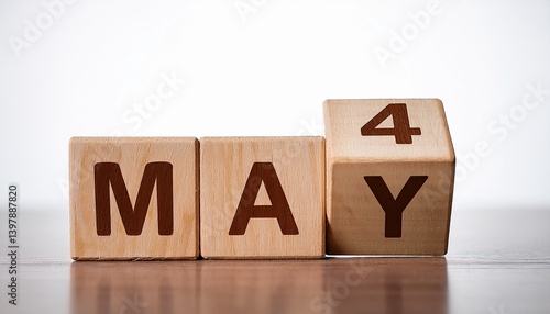 Minimalist photo of wooden blocks with date 4 May. Day and month, calendar on white background
